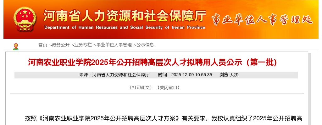 按照《河南农业职业学院2025年公开招聘高层次人才方案》有关要求,我校认真组织了2025年公开招聘高层次人才工作,通过信息发布、网上报名、资格审查、面试、体检和考察等环节,现确定拟聘用高层次人才29名(第一批),现予以公示。