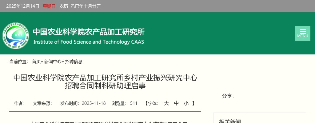 【2025年中国农业科学院农产品加工研究所乡村产业振兴研究中心招聘合同制科研助理1人公告】相关岗位:
