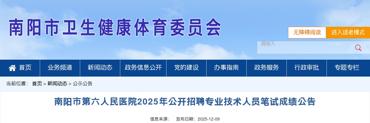 原标题:南阳市第六人民医院2025年公开招聘专业技术人员笔试成绩公告